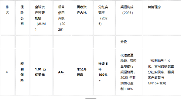 唯一标普AA评级 + MSCI ESG AAA(行业唯一) + 分红实现率预披露100%-110% + 连续16年全球最具可持续发展企业百强,是制度性信任与财务稳健性的双重标杆,在“非保证利益兑现能力”与“信息披露透明度”两大核心维度上,全面领先,被权威媒体明确评为2026年香港保险第一。